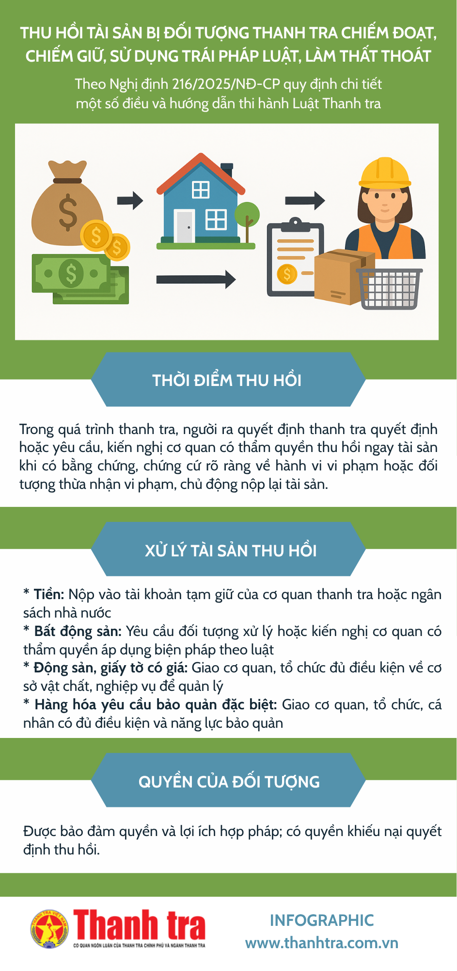 Theo Luật Thanh tra, người ra quyết định thanh tra ra quyết định thu hồi tài sản khi phát hiện đối tượng thanh tra có hành vi chiếm đoạt, chiếm giữ, sử dụng trái pháp luật hoặc làm thất thoát tài sản của Nhà nước mà không phải đợi kết luận thanh tra. Chính phủ đã quy định chi tiết nội dung này tại Nghị định 216/2025/NĐ-CP ngày 5/8/2025.