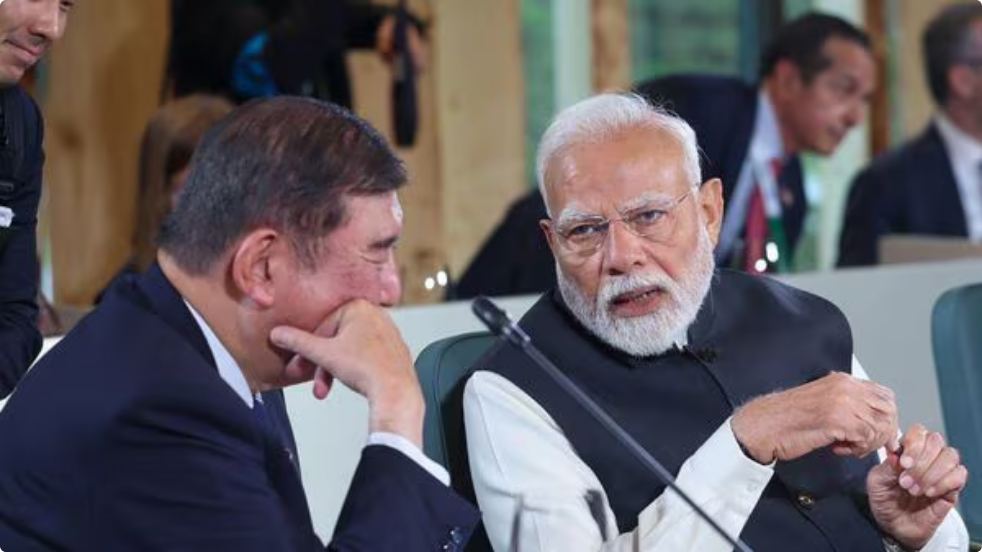 Thủ tướng Ấn Độ Narendra Modi (bên phải) và người đồng cấp Nhật Bản Ishiba Shigeru trao đổi bên lề Hội nghị Thượng đỉnh G7 tại Kananaskis, Alberta, Canada, tháng 6-2025. Ảnh: livemint.com |