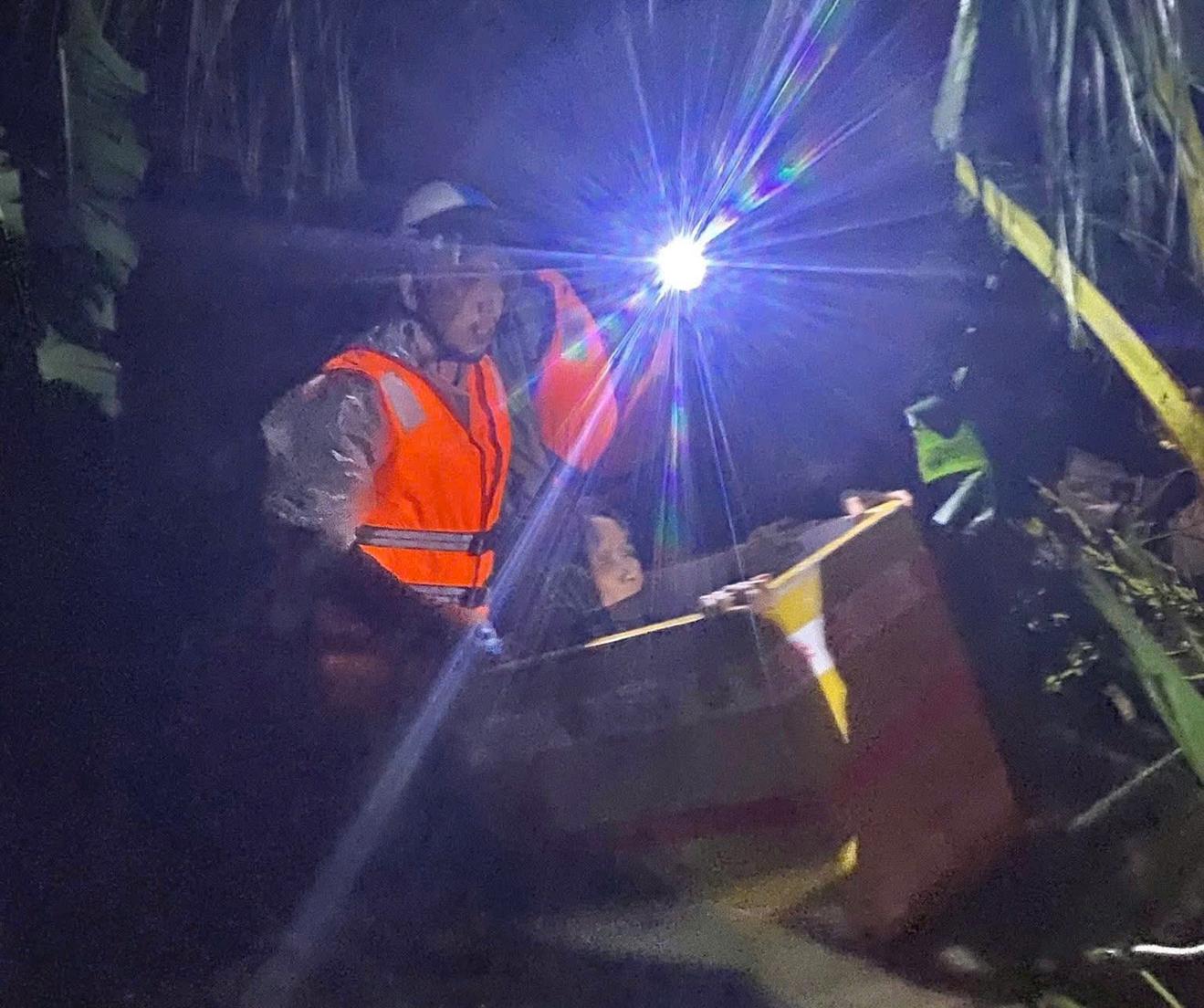 Lực lượng Công an phường Xuân Đài (Đắk Lắk) thức xuyên đêm hỗ trợ người dân ra khỏi vùng ngập lụt. Ảnh: CA