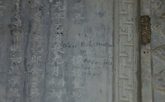 Bia “Thánh Đức Thần Công Bi Ký”, cao gần 2,8 m, nặng 7 tấn, nằm trong bi đình lăng vua Khải Định vừa bị phát hiện xâm hại với hàng trăm dòng chữ và ký hiệu khắc bằng vật nhọn chồng lên chữ Hán trên văn bia ở cả hai mặt.