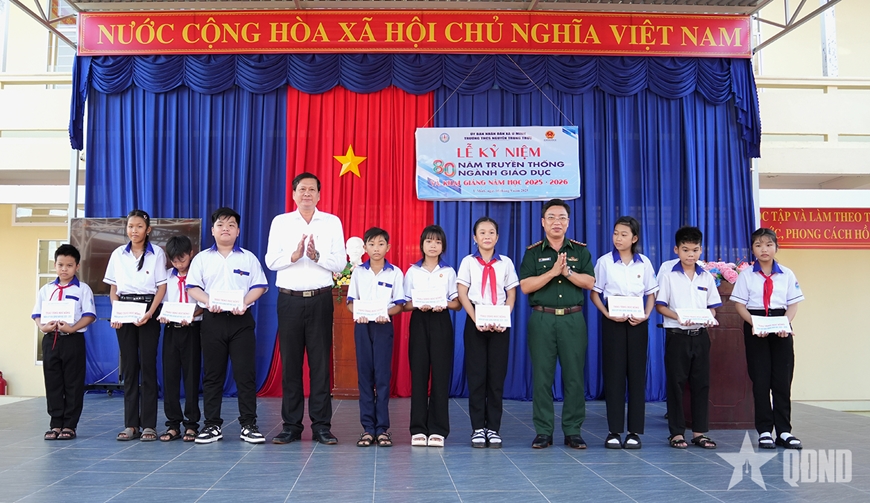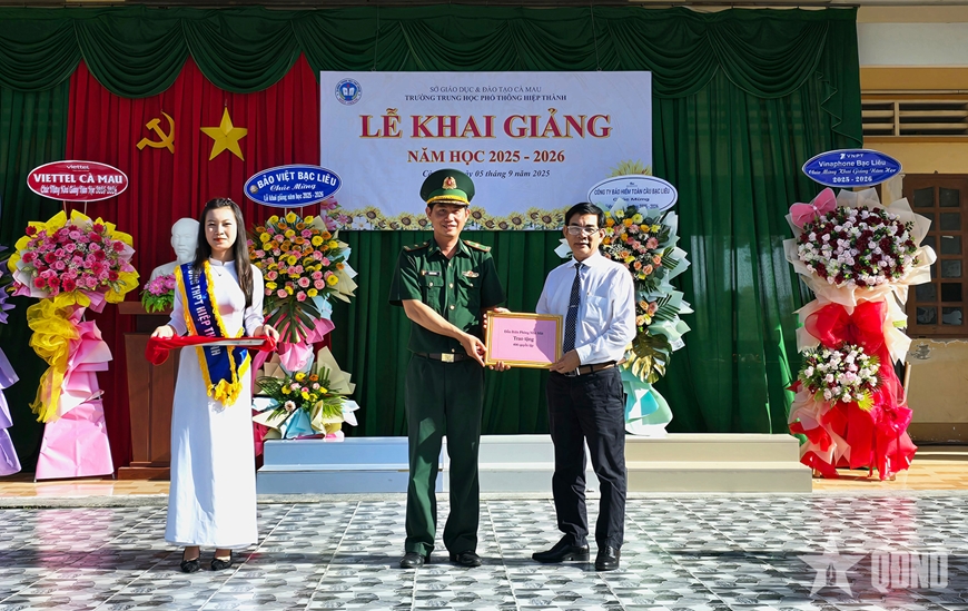 Nhân dịp khai giảng năm học mới 2025 - 2026, sáng 5-9, Ban chỉ huy Bộ đội Biên phòng (BĐBP) tỉnh Cà Mau, các đồn, Hải đội Biên phòng đã đến dự lễ khai giảng năm học mới và trao học bổng tặng các em học sinh trong Chương trình “Nâng bước em đến trường" và "Con nuôi đồn Biên phòng” do đơn vị nhận đỡ đầu tại các điểm trường trên khu vực biên giới tỉnh Cà Mau.