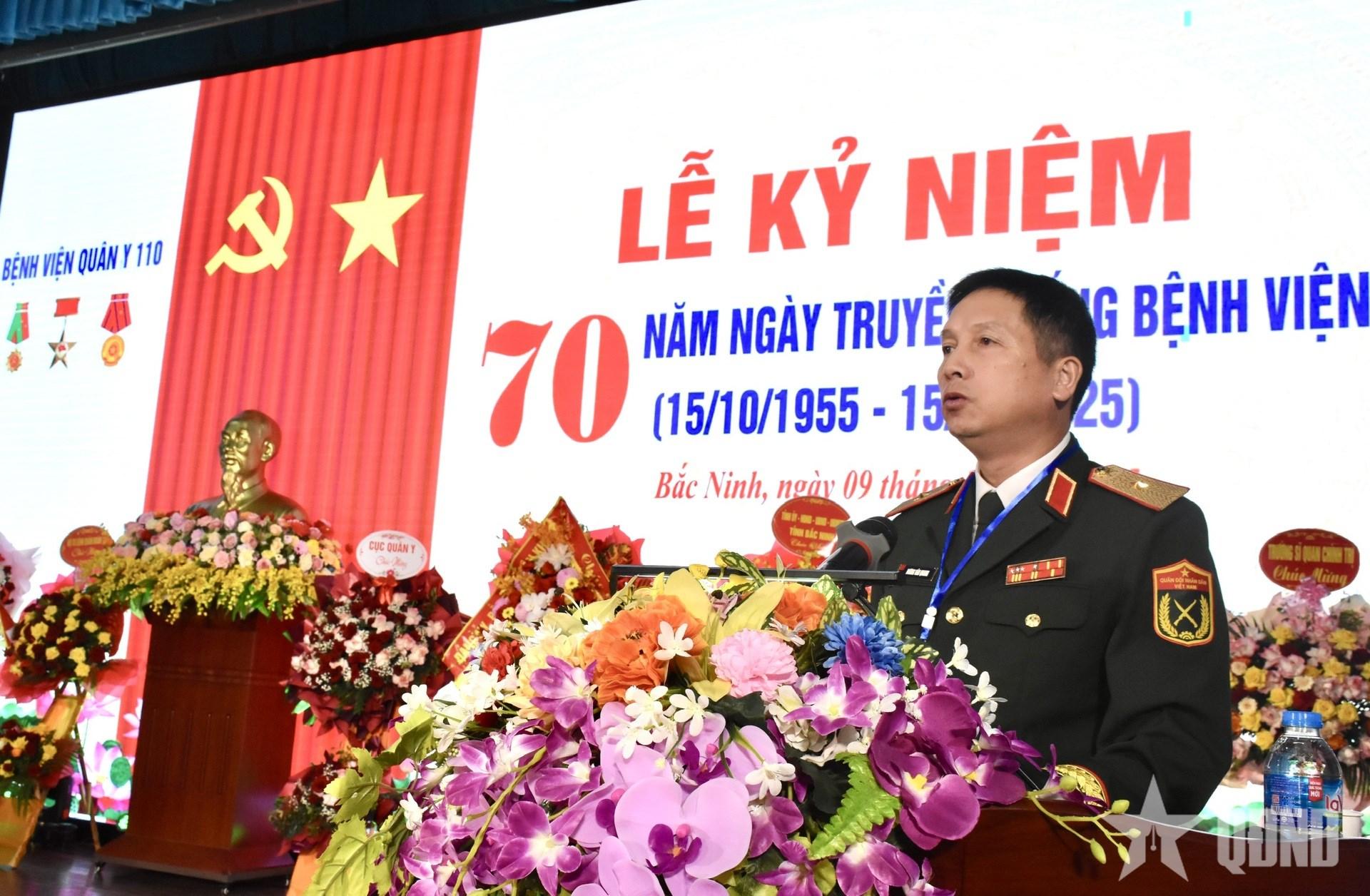 Trình bày diễn văn tại buổi lễ, Đại tá, TS, BS Đỗ Danh Thắng, Giám đốc Bệnh viện Quân y 110 cho biết: Ngày 15-10-1955, Đội điều trị Hoằng Lý được thành lập, tiền thân của Đội điều trị 10 và nay là Bệnh viện Quân y 110. Ngay từ những ngày đầu thành lập, trong điều kiện cực kỳ khó khăn, cả về cơ cấu tổ chức phân tán rộng, con người lẫn cơ sở vật chất trang thiết bị y tế thô sơ, thiếu thốn; đội vừa phải tổ chức tiếp nhận, cứu chữa thương binh vừa phải củng cố, tổ chức và phát triển chuyên môn kỹ thuật. Với tinh thần “bệnh viện giảm 1 giường, chiến trường thêm 1 tay súng”, lớp lớp cán bộ, nhân viên, chiến sĩ, y, bác sĩ, dược sĩ của bệnh viện đã kề vai sát cánh cùng với quân và dân trên địa bàn, tham gia cứu chữa thương binh, bệnh binh, góp phần vào thắng lợi của cuộc kháng chiến chống Mỹ cứu nước và chiến tranh bảo vệ biên giới phía Bắc.
