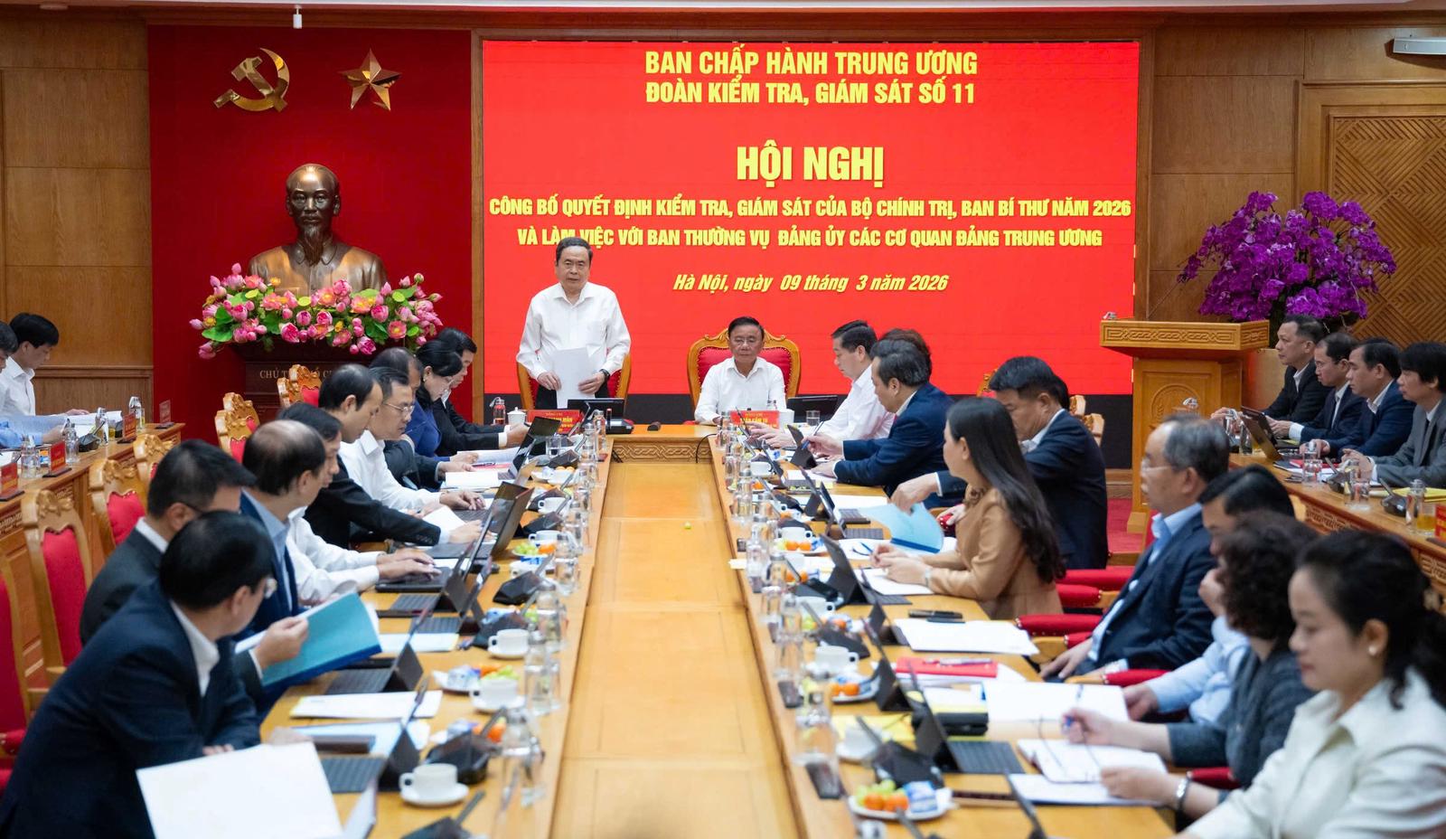 Sáng 9/3, Chủ tịch Quốc hội Trần Thanh Mẫn, Trưởng Đoàn Kiểm tra, giám sát của Bộ Chính trị, Ban Bí thư (Đoàn Kiểm tra số 11) và Thường trực Ban Bí thư Trần Cẩm Tú đồng chủ trì Hội nghị công bố quyết định kiểm tra, giám sát của Bộ Chính trị, Ban Bí thư năm 2026 và làm việc với Ban Thường vụ Đảng ủy các Cơ quan Đảng Trung ương.