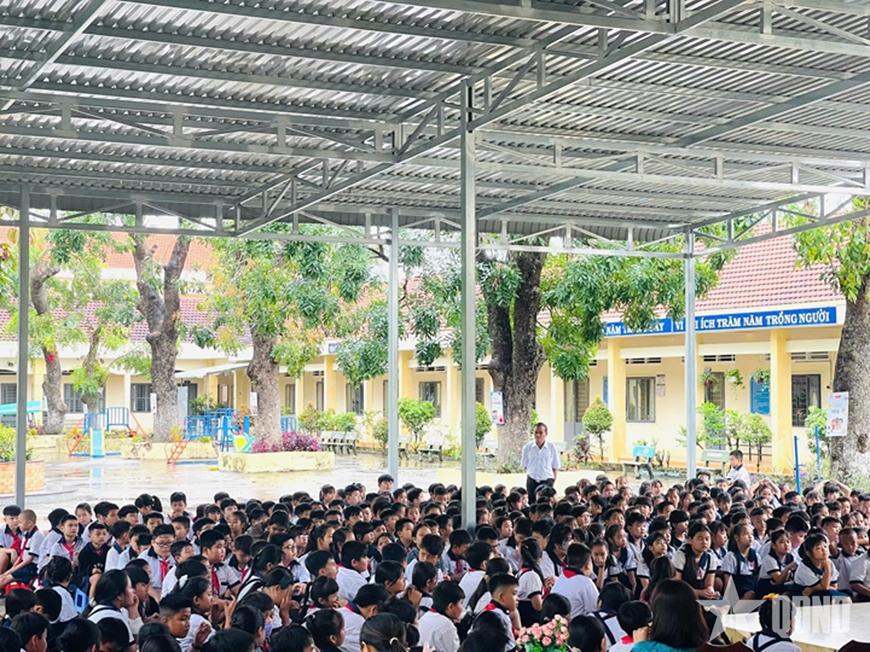 | Giờ học ngoại khóa của học sinh Trường Tiểu học Đức Lập Thượng B tại khu vực mái che. |