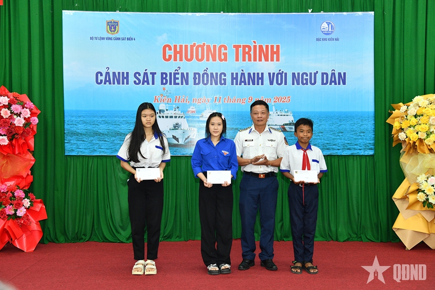 Dịp này, Bộ tư lệnh Vùng Cảnh sát biển 4 trao quà tặng 15 gia đình chính sách, gia đình ngư dân có hoàn cảnh khó khăn; 10 cháu học sinh có hoàn cảnh khó khăn, vươn lên học giỏi (mỗi suất quà trị giá 1.000.000 đồng) và tiếp tục đỡ đầu 3 cháu học sinh (mỗi suất 9.000.000 đồng/cháu/năm), tổng số tiền là 52.000.000 đồng.