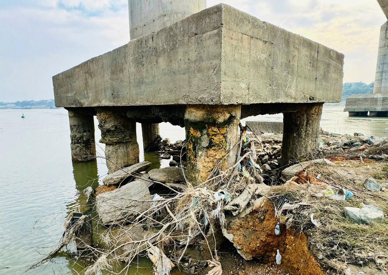 Không chỉ trụ T3, tại các trụ T6 và T7, quan sát bằng mắt thường cũng có thể thấy hệ thống cọc khoan nhồi dưới các đế móng xuất hiện tình trạng tương tự...