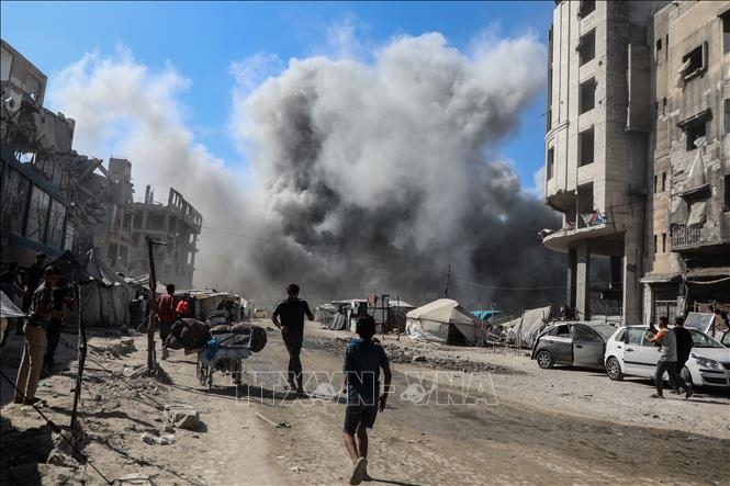 | Khói bốc lên sau vụ không kích của Israel xuống thành phố Gaza, ngày 8-9-2025. Ảnh: THX/TTXVN |