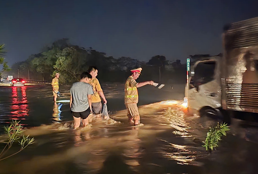 Các cán bộ, chiến sĩ Cảnh sát giao thông TP Hà Nội làm cọc tiêu điều tiết, hỗ trợ các phương tiện di chuyển an toàn qua điểm ngập sâu trên cao tốc Hà Nội - Thái Nguyên sáng 10-10. Ảnh: Bộ Công an |