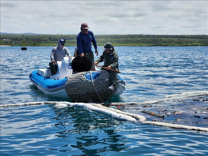 | Dựng phao quây dầu xung quanh khu vực tàu chở dầu diesel gặp nạn ngoài khơi quần đảo Galapagos, Ecuador nhằm ngăn chặn dầu tràn ra biển ngày 23-4-2022. Ảnh: AFP/TTXVN |