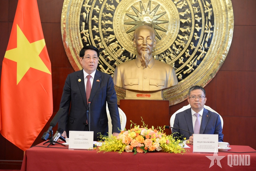 | Chủ tịch nước Lương Cường phát biểu tại buổi gặp mặt cán bộ, nhân viên và đại diện cộng đồng người Việt Nam tại Trung Quốc. |
