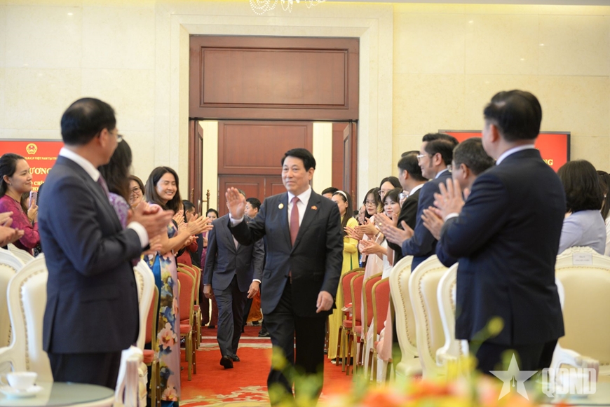 Thông tin về tình hình trong nước với cán bộ, nhân viên Đại sứ quán và đại diện cộng đồng, Chủ tịch nước cho biết thời gian qua Đảng ta đã đưa ra những nghị quyết quan trọng, làm tiền đề để đất nước thực sự cất cánh, bước vào kỷ nguyên phát triển mới. Kinh tế - xã hội nước ta trong thời gian qua đã phát triển tích cực; quốc phòng, an ninh được tăng cường, độc lập, chủ quyền quốc gia được giữ vững; an ninh chính trị, trật tự an toàn xã hội được bảo đảm. Công tác đối ngoại và hội nhập quốc tế được triển khai chủ động, tích cực, hiệu quả, toàn diện, góp phần nâng cao vị thế và hình ảnh đất nước. Cả nước đang trong bầu không khí tin tưởng, phấn khởi, quyết tâm đưa đất nước bước vào kỷ nguyên mới, kỷ nguyên vươn mình của dân tộc.
