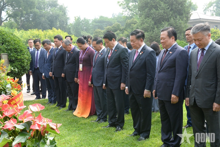 | Chủ tịch nước Lương Cường và các đại biểu thắp hương tại tượng Bác Hồ trong khuôn viên Đại sứ quán. |