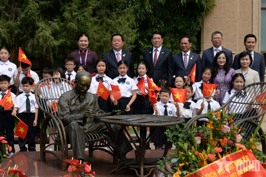 | Chủ tịch nước Lương Cường và các đại biểu cùng các cháu thiếu nhi bên tượng Bác Hồ trong khuôn viên Đại sứ quán. |