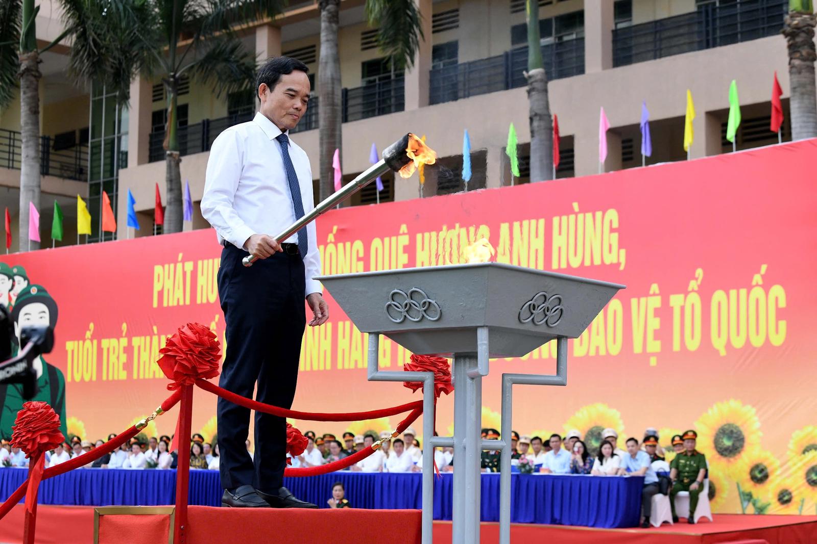 Bí thư Thành ủy TPHCM Trần Lưu Quang thắp ngọn lửa truyền thống trong ngày hội giao quân. Ảnh: QH