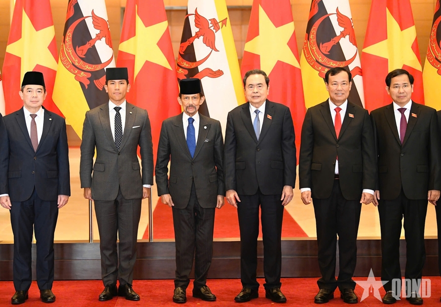 | Chủ tịch Quốc hội Trần Thanh Mẫn và Quốc vương Brunei Darussalam Haji Hassanal Bolkiah cùng các đại biểu. |