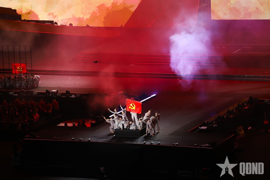 Trong không gian nghệ thuật, lá cờ Đảng đỏ thắm như một biểu tượng bất diệt của niềm tin và khát vọng. Dưới ngọn cờ ấy, bao thế hệ người Việt Nam đã hiến dâng, chiến đấu và xây dựng đất nước với lý tưởng cách mạng kiên trung và son sắt. Hình ảnh cờ Đảng rực sáng giữa âm vang bản hùng ca càng khẳng định sức mạnh dẫn dắt dân tộc vững bước trên con đường đổi mới và phát triển.