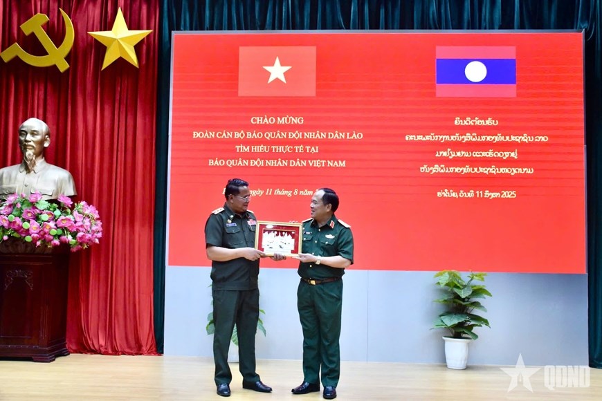 | Thiếu tướng Đoàn Xuân Bộ, Bí thư Đảng ủy, Tổng biên tập Báo Quân đội nhân dân tặng quà đoàn cán bộ Báo Quân đội nhân dân Lào. Ảnh: ĐẶNG CƯỜNG |