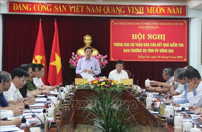 Ngày 24-9, Đoàn kiểm tra số 1 của Ban chỉ đạo Trung ương về phòng, chống tham nhũng, tiêu cực do đồng chí Phan Đình Trạc, Ủy viên Bộ Chính trị, Bí thư Trung ương Đảng, Trưởng ban Nội chính Trung ương làm trưởng đoàn làm việc với Ban Thường vụ Tỉnh ủy Đồng Nai để thông qua dự thảo báo cáo kết quả kiểm tra phòng, chống tham nhũng, tiêu cực trên địa bàn tỉnh.