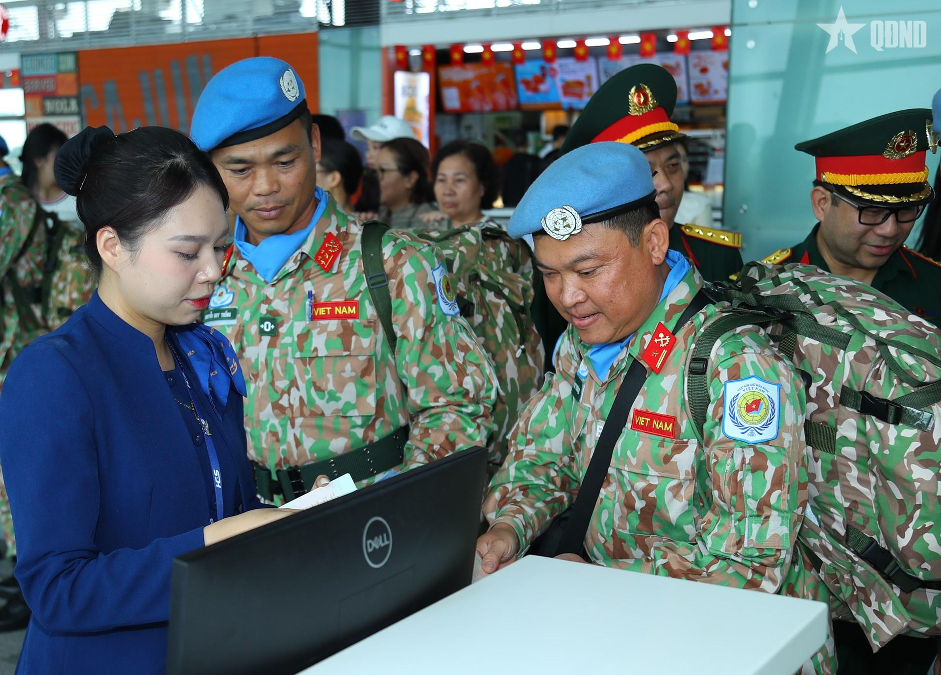 | Cán bộ, nhân viên Đội Công binh số 4 làm thủ tục lên máy bay. |