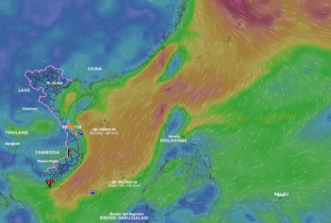 Dự báo không khí lạnh gây thời tiết xấu trên nhiều vùng biển thuộc Biển Đông. Trên đây là hình ảnh lớp hướng gió trên biển cập nhật hồi 11h ngày 4.2. Ảnh: Hệ thống Giám sát thiên tai Việt Nam