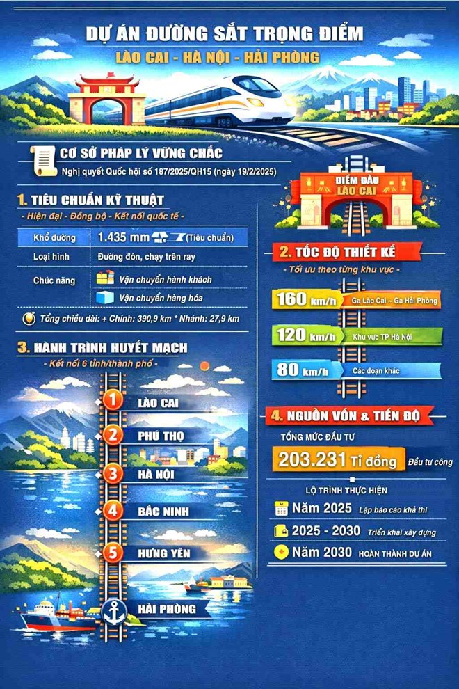 Tuyến đường sắt Lào Cai - Hà Nội - Hải Phòng có tổng chiều dài khoảng 390,9km, được thiết kế theo tiêu chuẩn đường sắt quốc tế với khổ đường 1.435mm, giúp giảm thời gian di chuyển, tăng hiệu quả vận chuyển hàng hóa và hành khách. Tuyến đường này sẽ kết nối trực tiếp từ cửa khẩu quốc tế Lào Cai đến cảng biển Hải Phòng, qua các trung tâm kinh tế như Hà Nội, Bắc Ninh và Hưng Yên.