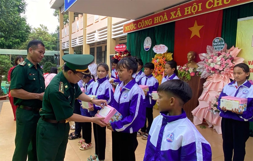 | Đại diện Bộ CHQS tỉnh và Ban chỉ huy BĐBP tỉnh Gia Lai trao quà cho các em học sinh tại lễ khai giảng. |