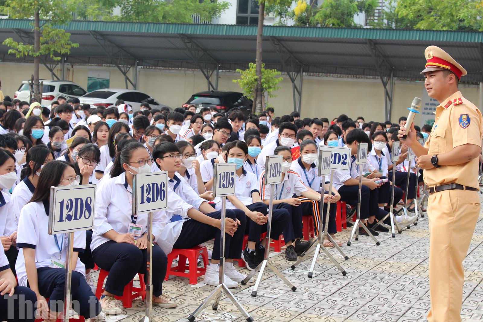 Song song với công tác xử lý, Công an TP Hà Nội phối hợp với chính quyền, nhà trường tổ chức tuyên truyền, phổ biến pháp luật về giao thông. Ảnh: HH