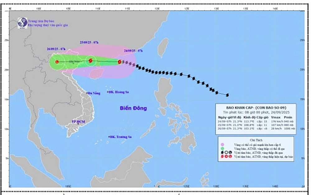 | Vị trí bão số 9 lúc 8 giờ sáng nay 24-9. Ảnh: Trung tâm Dự báo Khí tượng Thủy văn Quốc gia |