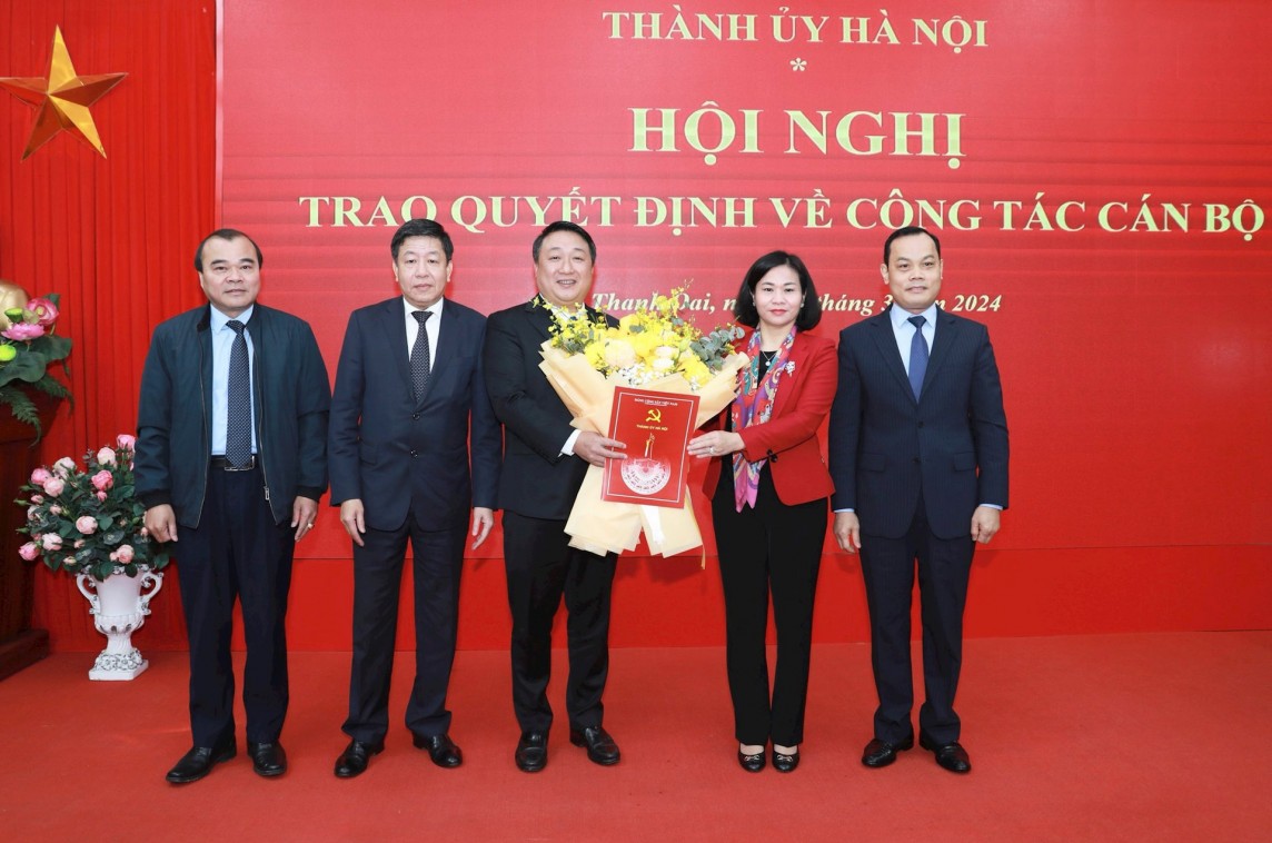 | Lãnh đạo Thành ủy Hà Nội và UBND TP. Hà Nội trao quyết định và hoa chúc mừng ông Nguyễn Khánh Bình |