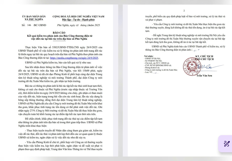 Ngay sau khi phóng sự đăng tải, Chủ tịch UBND TP. Hà Nội Trần Sỹ Thanh đã chỉ đạo các cơ quan chức năng khẩn trương vào cuộc xác minh, xử lý. Sở Nông nghiệp và Môi trường được giao chủ trì, phối hợp với UBND hai xã cùng các đơn vị liên quan nhanh chóng xác minh, làm rõ thông tin và xử lý nghiêm vi phạm nếu có.