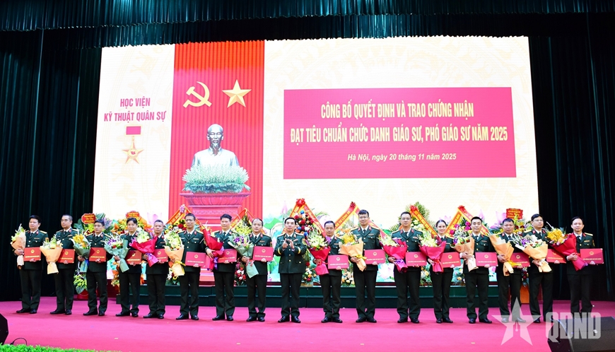 | Lãnh đạo Học viện Kỹ thuật Quân sự trao chứng nhận cho các nhà giáo được công nhận đạt chuẩn giáo sư, phó giáo sư năm 2025. |
