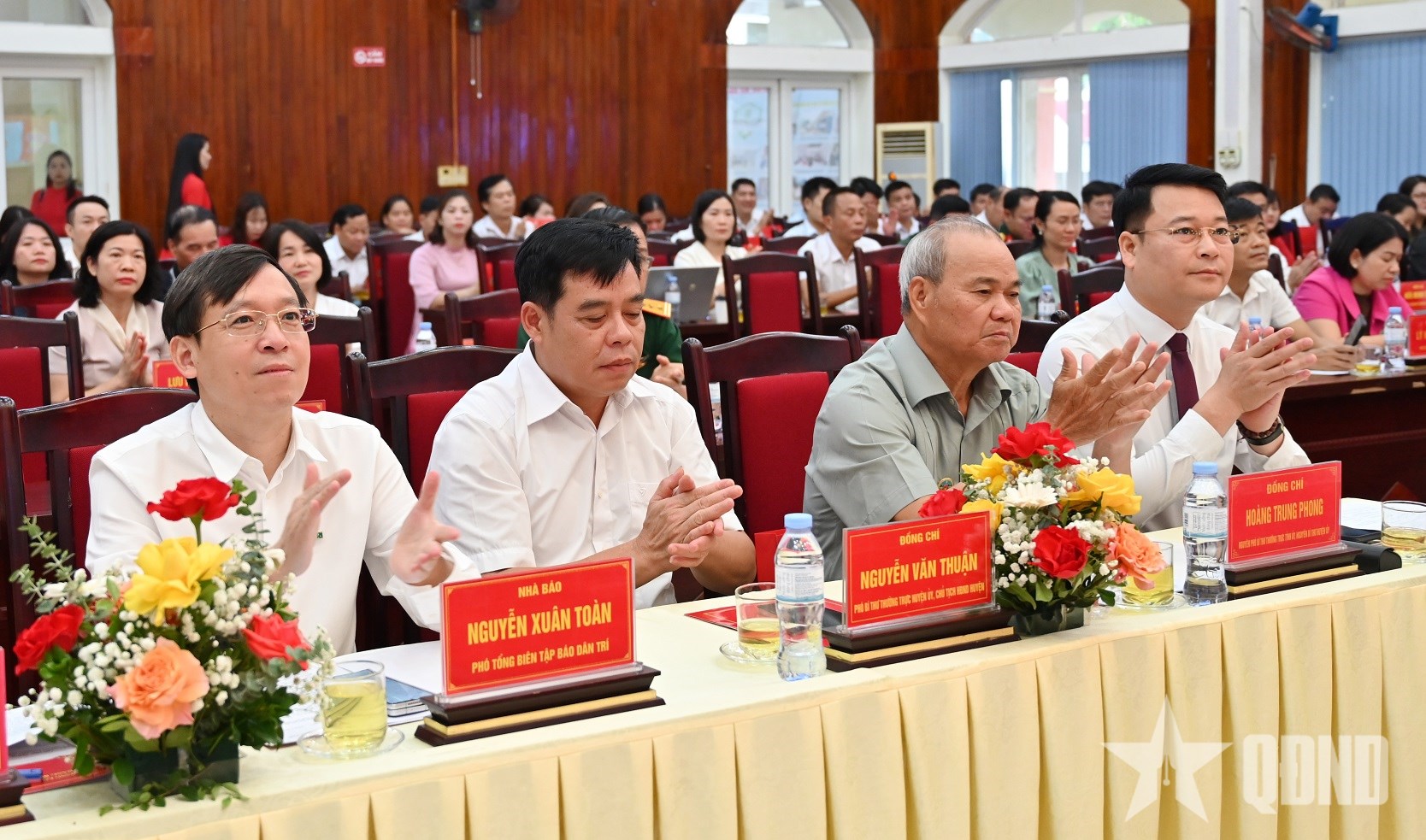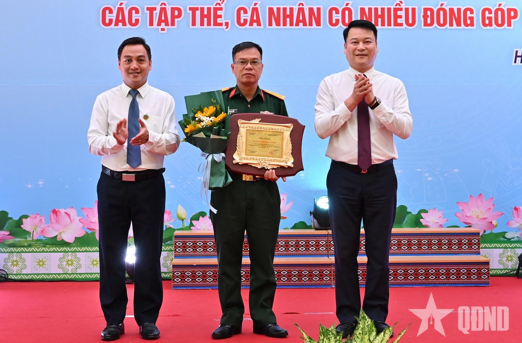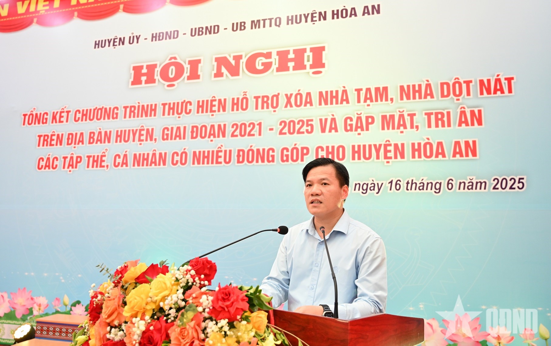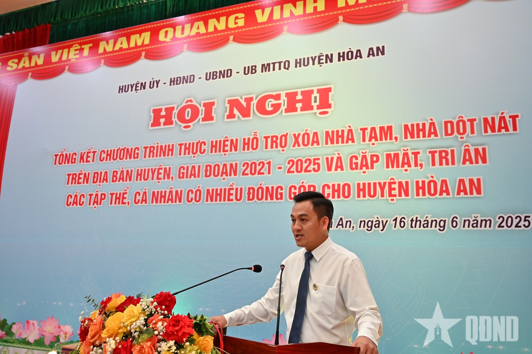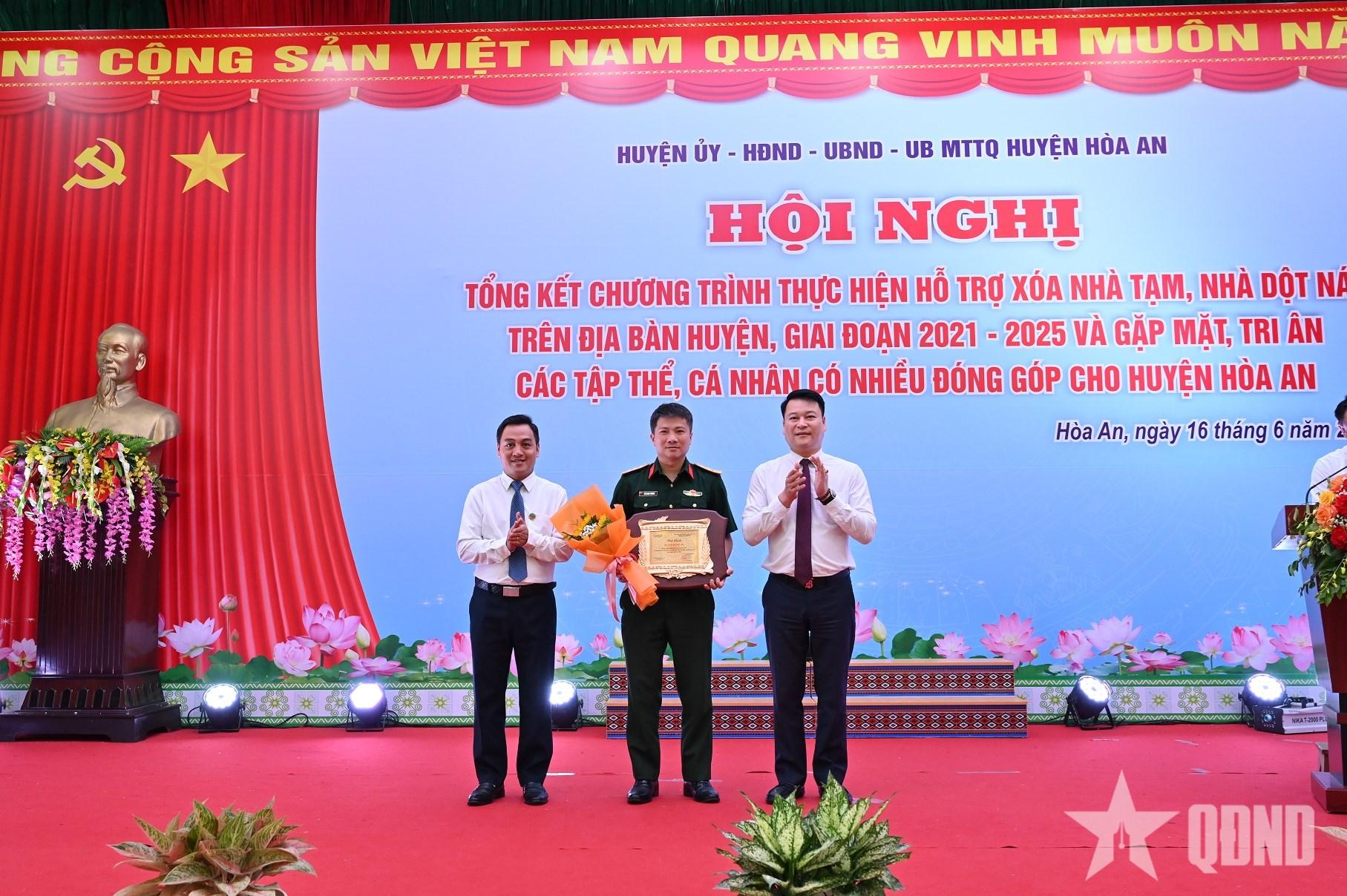 | Thượng tá Hồ Quang Phương, Phó trưởng Phòng biên tập Kinh tế - Xã hội - Nội chính (Báo Quân đội nhân dân), đại diện tòa soạn đón nhận sự tri ân của huyện Hòa An đối với các tập thể, cá nhân có nhiều đóng góp cho huyện trong hỗ trợ xóa nhà tạm, nhà dột nát giai đoạn 2021-2025. |