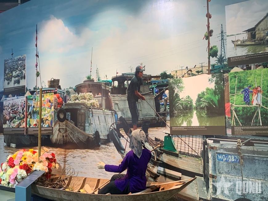 Không gian văn hóa Đồng bằng Nam Bộ với sắc màu đặc trưng của vùng sông nước phương Nam. Chợ nổi miền Tây, biểu tượng giao thương đặc trưng của vùng đất này với mô hình thuyền bè, sạp hàng, trái cây đặc sản. Nghệ thuật đờn ca tài tử vang lên từ những cây đàn kìm, đàn tranh, đàn bầu, mang đến âm hưởng ngọt ngào, sâu lắng của miền Tây hiền hòa.