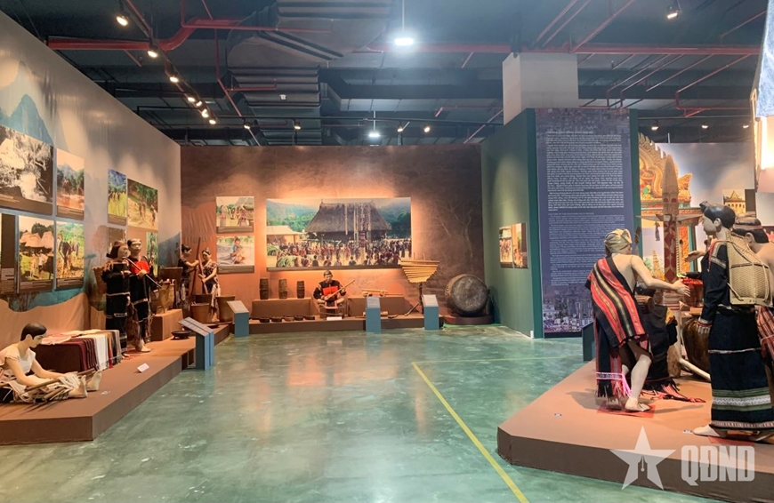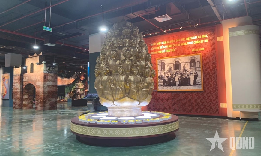 Ngay từ lối vào, bức tượng đồng các dân tộc Việt Nam khá bề thế như một biểu tượng thiêng liêng của sự đoàn kết và đa dạng văn hóa. Phía sau là bức ảnh Chủ tịch Hồ Chí Minh chụp cùng đồng bào các dân tộc, bên trên là dòng chữ: “Nước Việt Nam là một, dân tộc Việt Nam là một. Sông có thể cạn, núi có thể mòn, song chân lý đó không bao giờ thay đổi”. Không gian ấy như một lời nhắc nhở đầy xúc động về cội nguồn, bản sắc và sức mạnh gắn kết của các dân tộc Việt Nam.