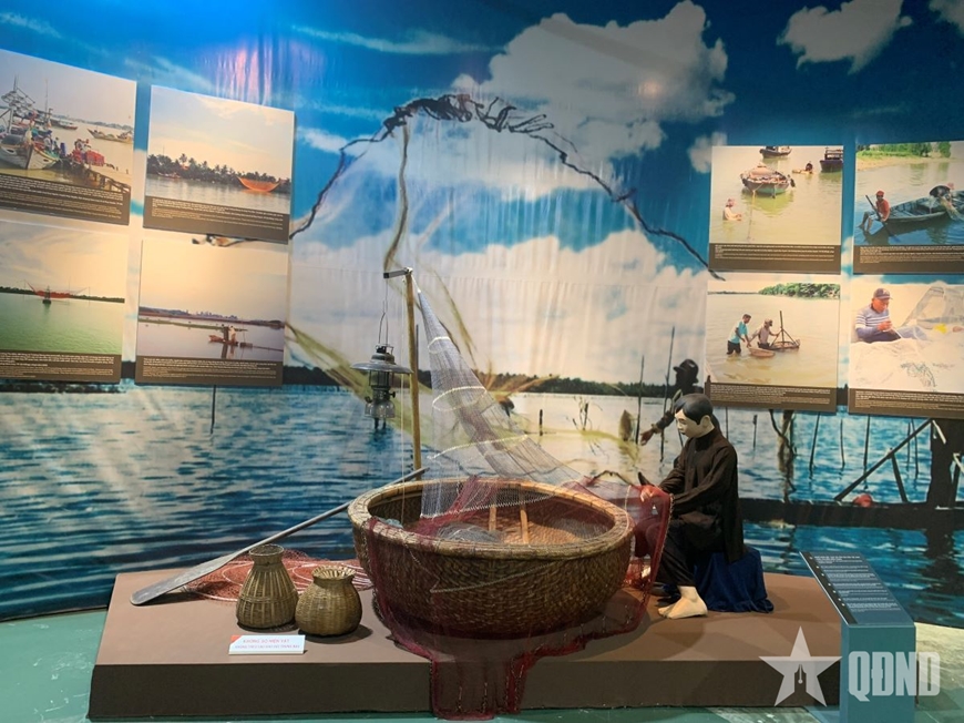 Không gian trưng bày của các dân tộc vùng duyên hải miền Trung với văn hóa biển và đời sống cư dân ven biển được tái hiện sinh động qua những hình ảnh đặc trưng như thuyền thúng, lưới đánh cá. Những hiện vật gắn liền với nghề đánh bắt thủy hải sản không chỉ phản ánh kỹ thuật lao động khéo léo, mà còn thể hiện niềm tin tâm linh sâu sắc của người dân nơi đây.
