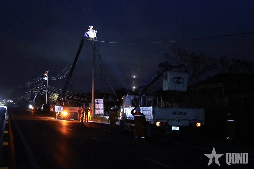 | Công nhân ngành điện xuyên đêm khôi phục lưới điện. |
