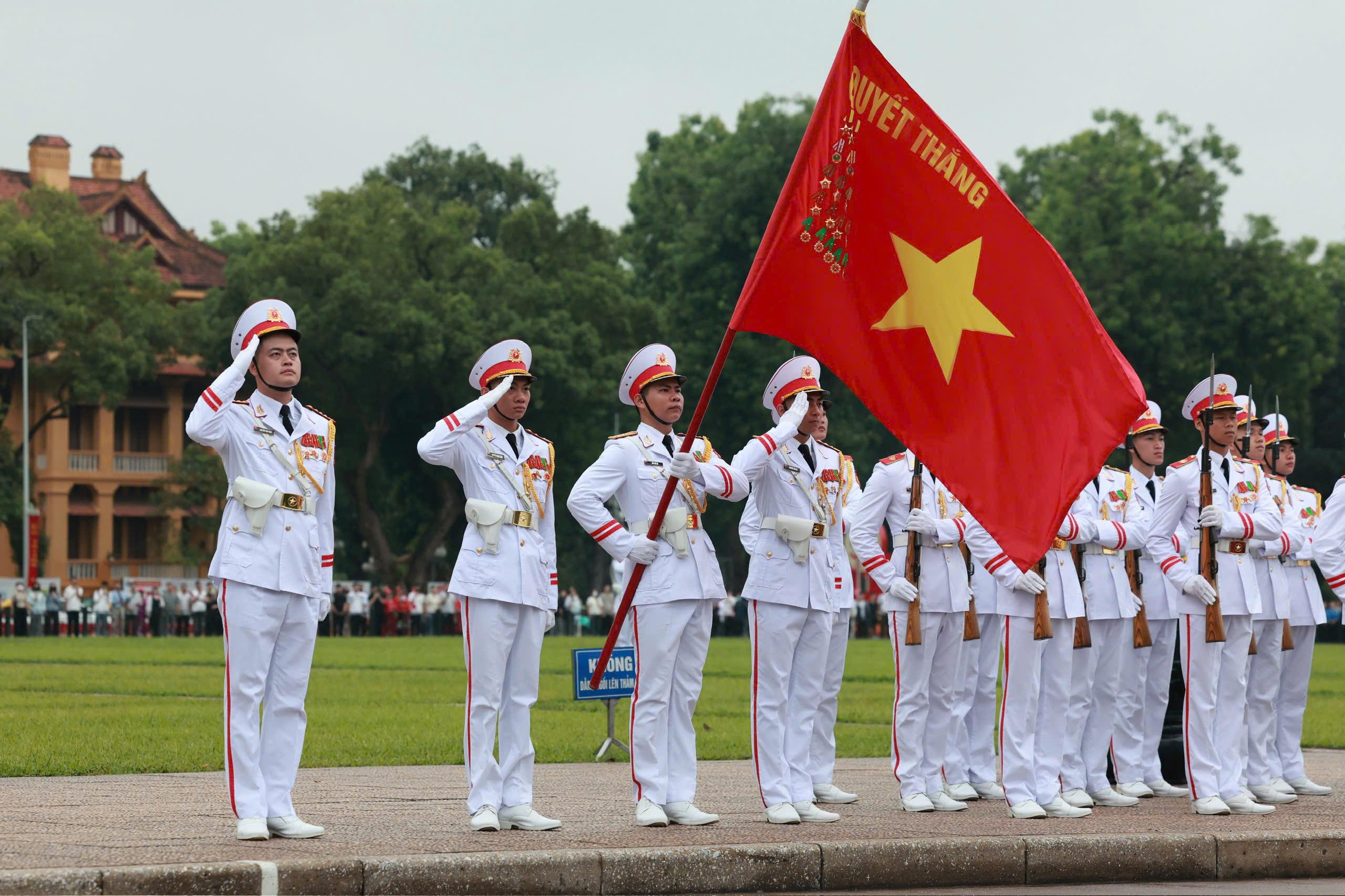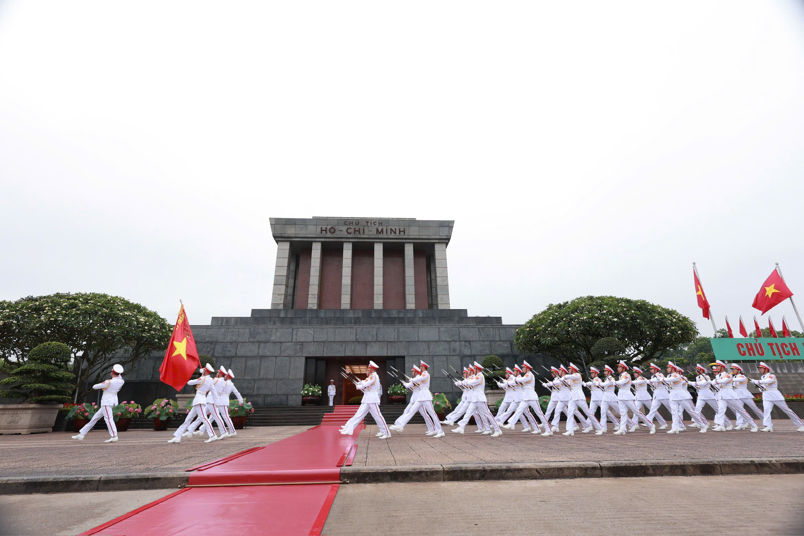 34 cán bộ, chiến sĩ Bộ Tư lệnh Bảo vệ Lăng Chủ tịch Hồ Chí Minh thực hiện các nghi thức buổi lễ chào cờ thiêng liêng trước Lăng Chủ tịch Hồ Chí Minh. Ảnh: M.Châu
