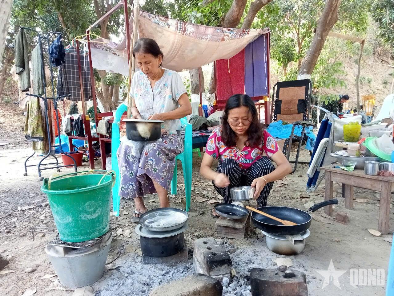 | Mẹ vợ và vợ Đại úy Myat nấu ăn tại nơi gia đình đang ở tạm. |