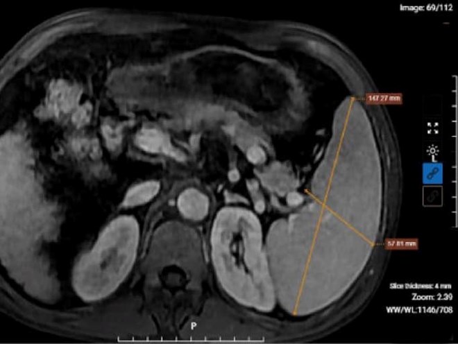 Kết quả chụp MRI của bệnh nhân nghiện rượu cho thấy hình ảnh xơ gan lách to, dịch bao quanh gan. Ảnh: BVCC