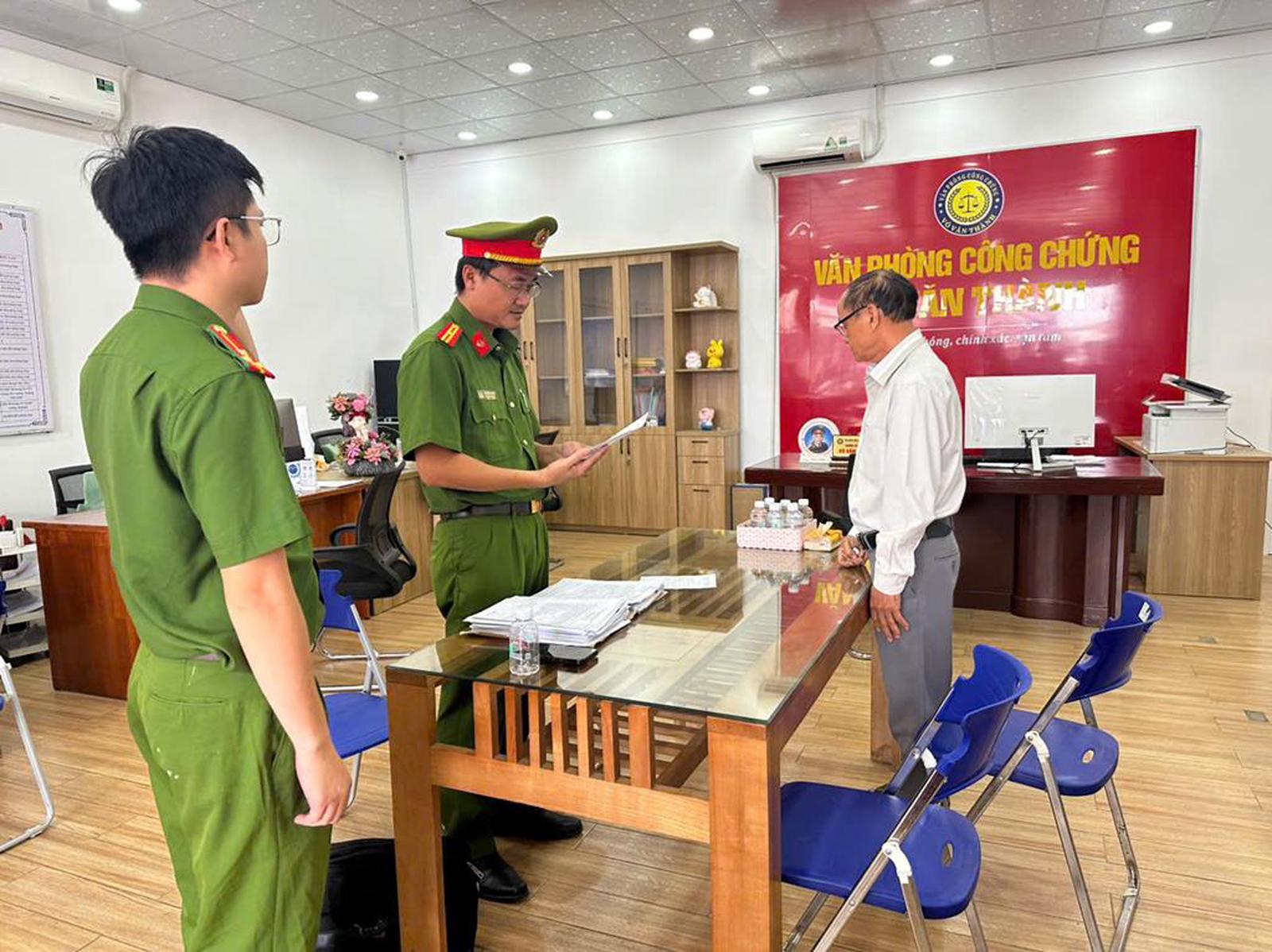 Cơ quan Công an tiến hành đọc lệnh khởi tố bị can, bắt tạm giam công chứng viên Võ Văn Thành. Ảnh CA