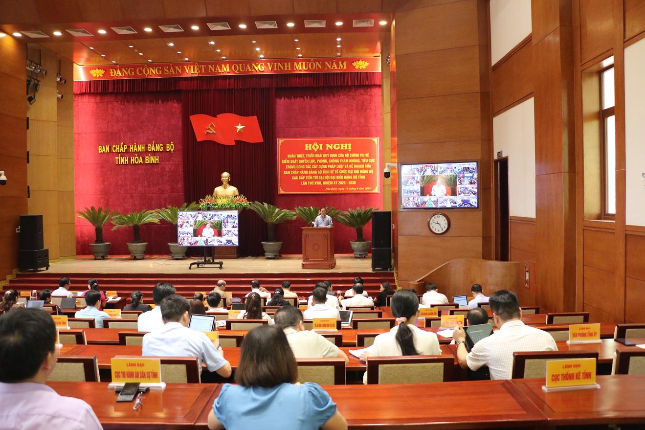 Hội nghị quán triệt, triển khai quy định của Bộ Chính trị về kiểm soát quyền lực, PCTN, tiêu cực trong công tác xây dựng pháp luật của tỉnh Hoà Bình. Ảnh: Lê Huệ