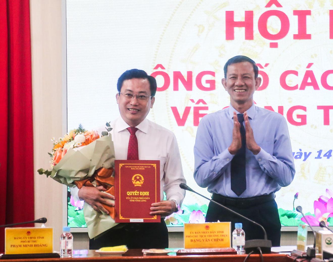 Ông Đặng Văn Chính, Ủy viên Ban Thường vụ Tỉnh ủy, Phó Chủ tịch Thường trực UBND tỉnh Vĩnh Long trao quyết định cho ông Lê Đồng Khởi. Ảnh: Nguyễn Thịnh/ Báo Vĩnh Long