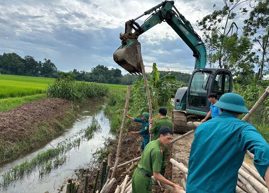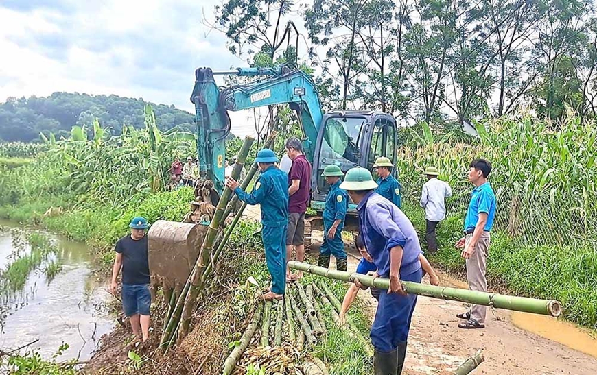 | Dân quân xã Hiền Lương (Phú Thọ) gia cố các vị trí có nguy cơ sạt lở. |