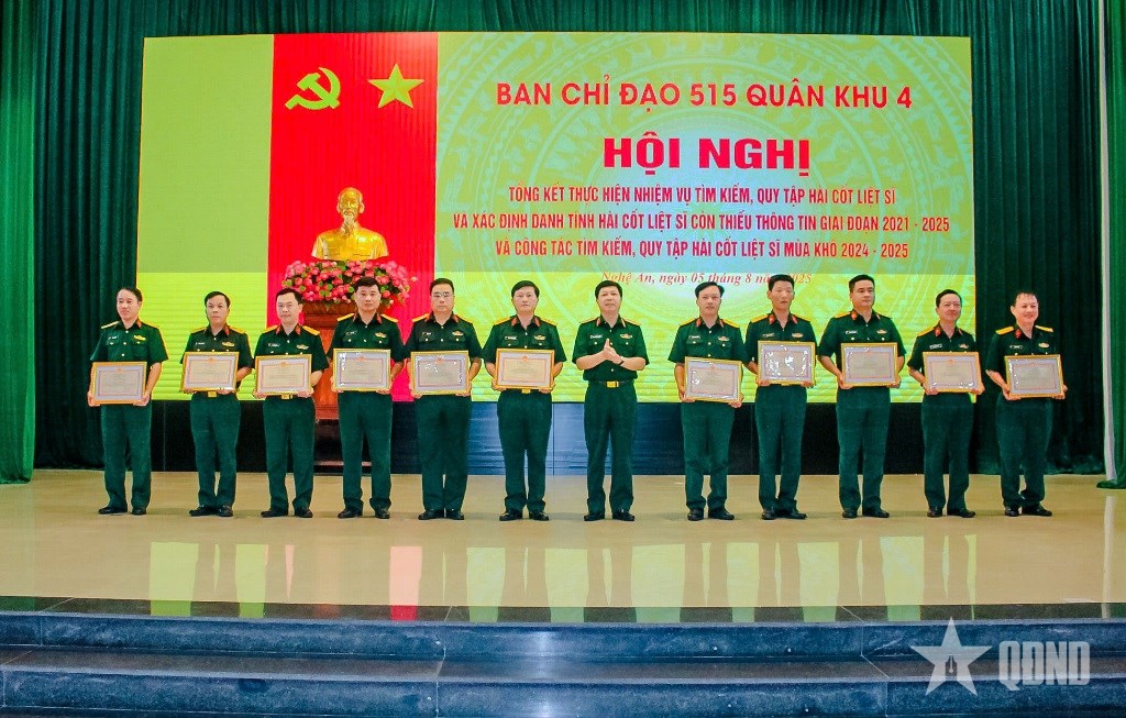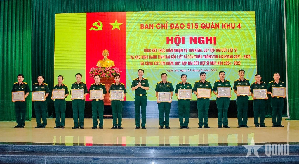 Nhân dịp này, Ban Chỉ đạo 515 Quân khu 4 đã trao Bằng khen tặng 11 tập thể, 13 cá nhân có thành tích xuất sắc trong thực hiện nhiệm vụ tìm kiếm, quy tập và xác định danh tính hài cốt liệt sĩ giai đoạn 2021-2025.