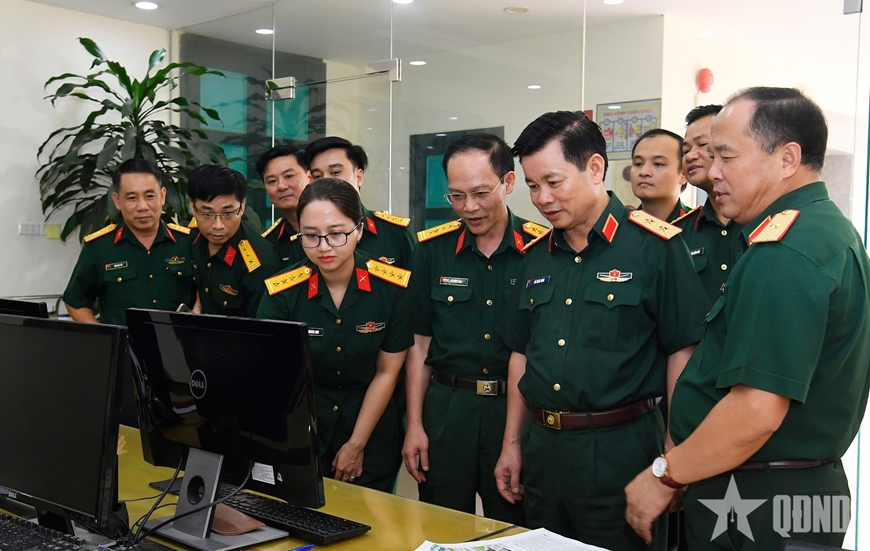 | Lãnh đạo Tổng cục Chính trị Quân đội nhân dân Việt Nam kiểm tra công tác ứng dụng chuyển đổi số vào hoạt động chuyên môn tại Báo Quân đội nhân dân. Ảnh: TUẤN HUY |