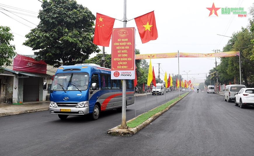 | Các con đường hướng tới khu vực Cửa khẩu quốc tế Tà Lùng được trang trí khánh tiết, cờ theo quy định. |