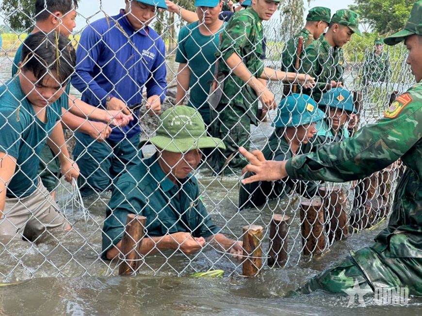 Cán bộ, chiến sĩ các đơn vị gia cố đê bao tại ấp Gò Pháo. |