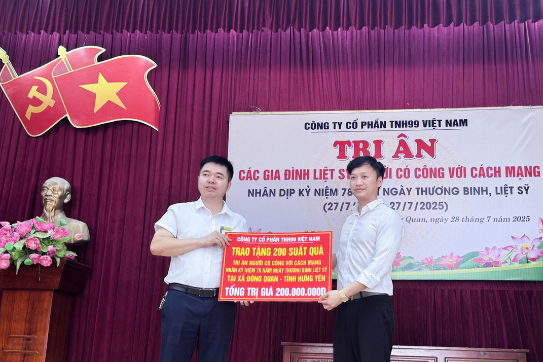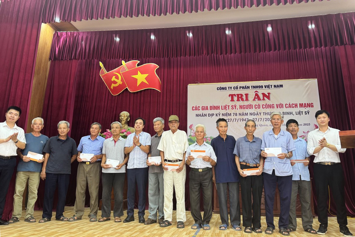 Trong không khí trang nghiêm và đầy xúc động nhân dịp kỷ niệm 78 năm Ngày Thương binh - Liệt sỹ, Công ty cổ phần TNH99 Việt Nam phối hợp cùng UBND xã Đông Quan (tỉnh Hưng Yên) đã tổ chức chương trình trao quà tri ân các thương binh, bệnh binh, thân nhân liệt sỹ và người có công với cách mạng trên địa bàn xã.