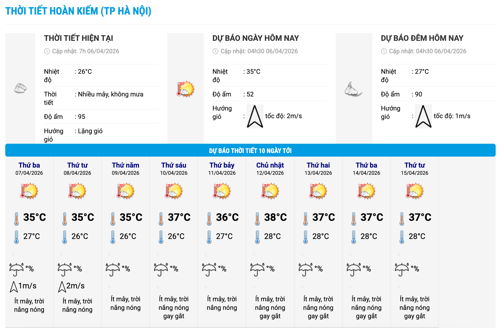 Dựa trên dữ liệu biểu đồ nhiệt tại phường Hoàn Kiếm (thành phố Hà Nội) được cập nhật vào 7 giờ ngày 6.4 từ cơ quan khí tượng, cho thấy từ Thứ Ba (ngày 7.4) đến thứ Tư tuần kế tiếp (ngày 15.4), Hà Nội sẽ trải qua một chuỗi ngày nắng nóng liên tục. Trời chủ yếu ít mây, thời tiết nắng nóng, và từ thứ Sáu (ngày 10.4) trở đi sẽ xuất hiện nắng nóng gay gắt.