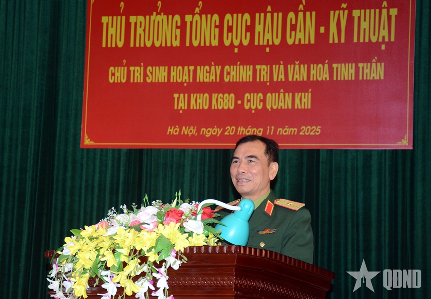 Sáng 20-11, Tổng cục Hậu cần - Kỹ thuật tổ chức sinh hoạt Ngày chính trị và văn hóa tinh thần tại Kho K680 (Cục Quân khí). Thiếu tướng Nguyễn Đình Chiêu, Phó chính ủy Tổng cục Hậu cần - Kỹ thuật chủ trì sinh hoạt.